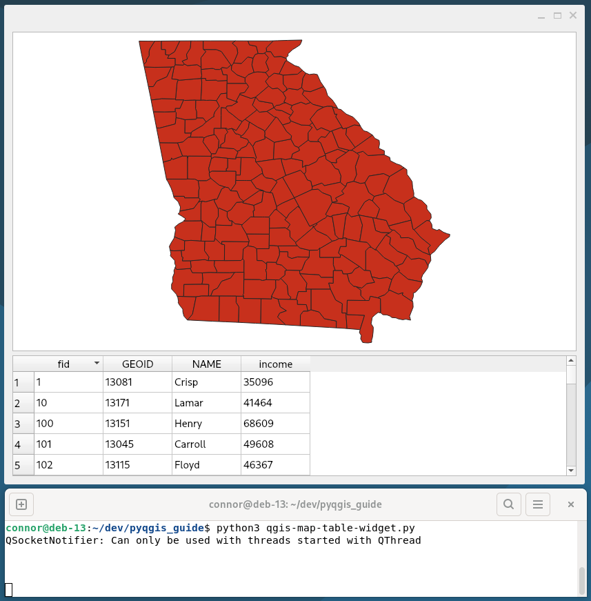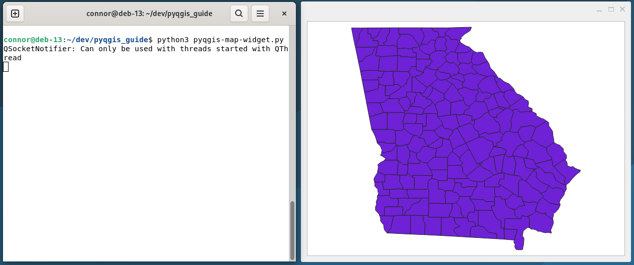 You can replace the ‘georgia’ layer with any vector layer you have available, just be sure that your QgsApplication.setPrefixPath