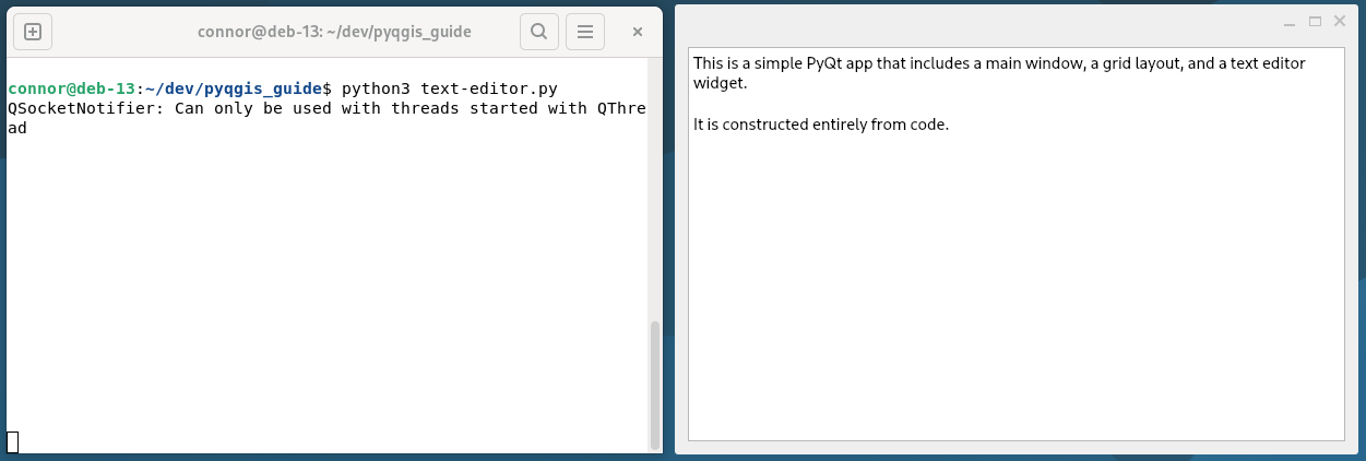 Here’s a simple app that Sherman uses to introduce PyQt. Running this code will open a new window on your screen showing the default text (“This is a simple PyQt app…”). It’s a bare text editor with no other functionality. I’ve just added a few comments to indicate what the code is doing.
